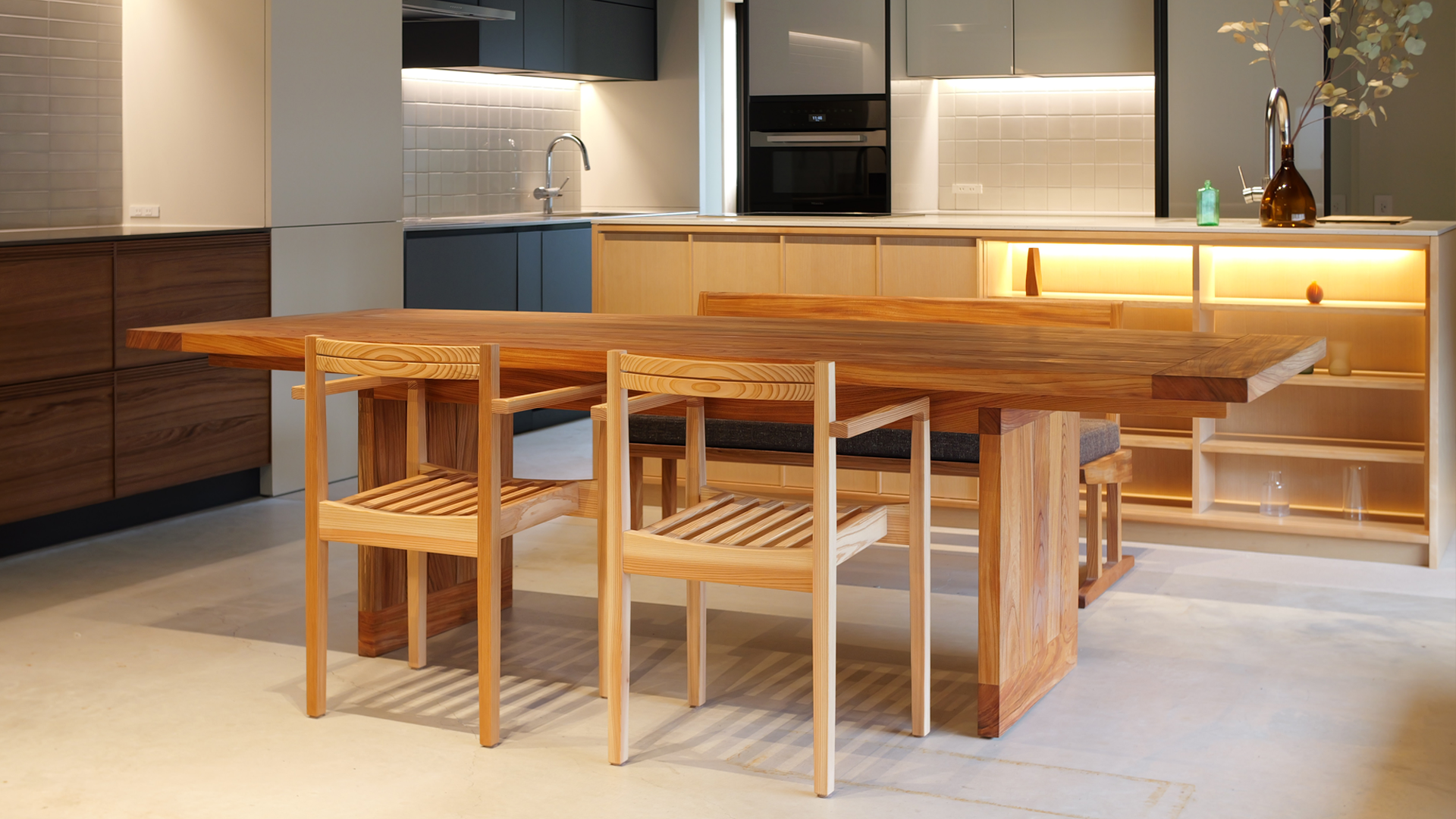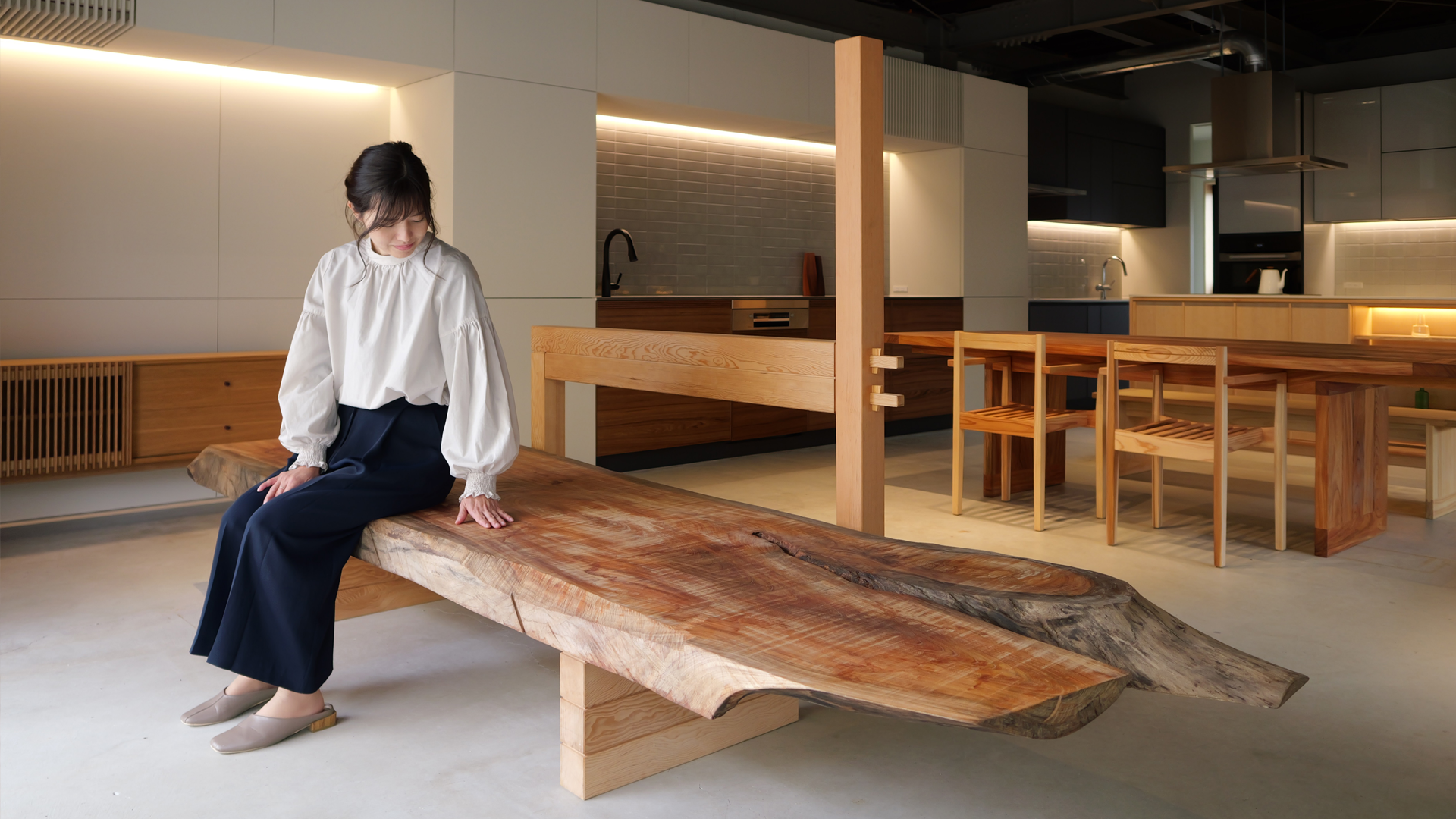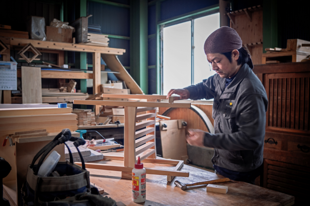 私たちは、徳島県の国府という地域で40年以上大工として家づくりを行い、木材の原産地の林業家や職人の人々と深い関わりを持ち、伐採から製材までの現場を長年目にしてきました。その過程で芽生える、木材の個性や、加工する職人の息遣いが伝わるような家具を、大工の技術を通じて形にしながら、共感できる人と繋がり、日本全国に活動の幅を広げています。