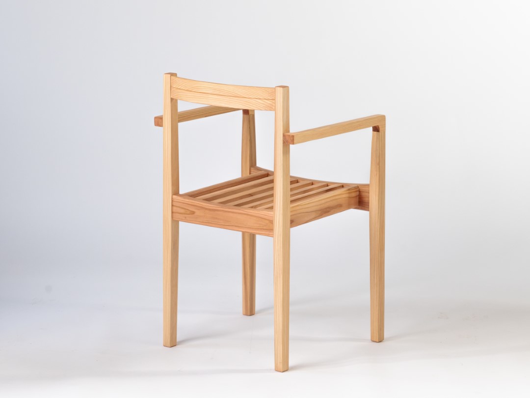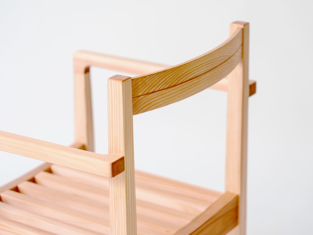 徳島県産の針葉樹を使い、高い木工技術により製作されたスタッキングチェア。直線的な構成の中に細かいアールやテーパーをつけ、ディテールに繊細さを宿している。座面と背もたれの寸法角度は、人間工学に基づいて設計しており、「道具」としての使いやすさにも配慮している。