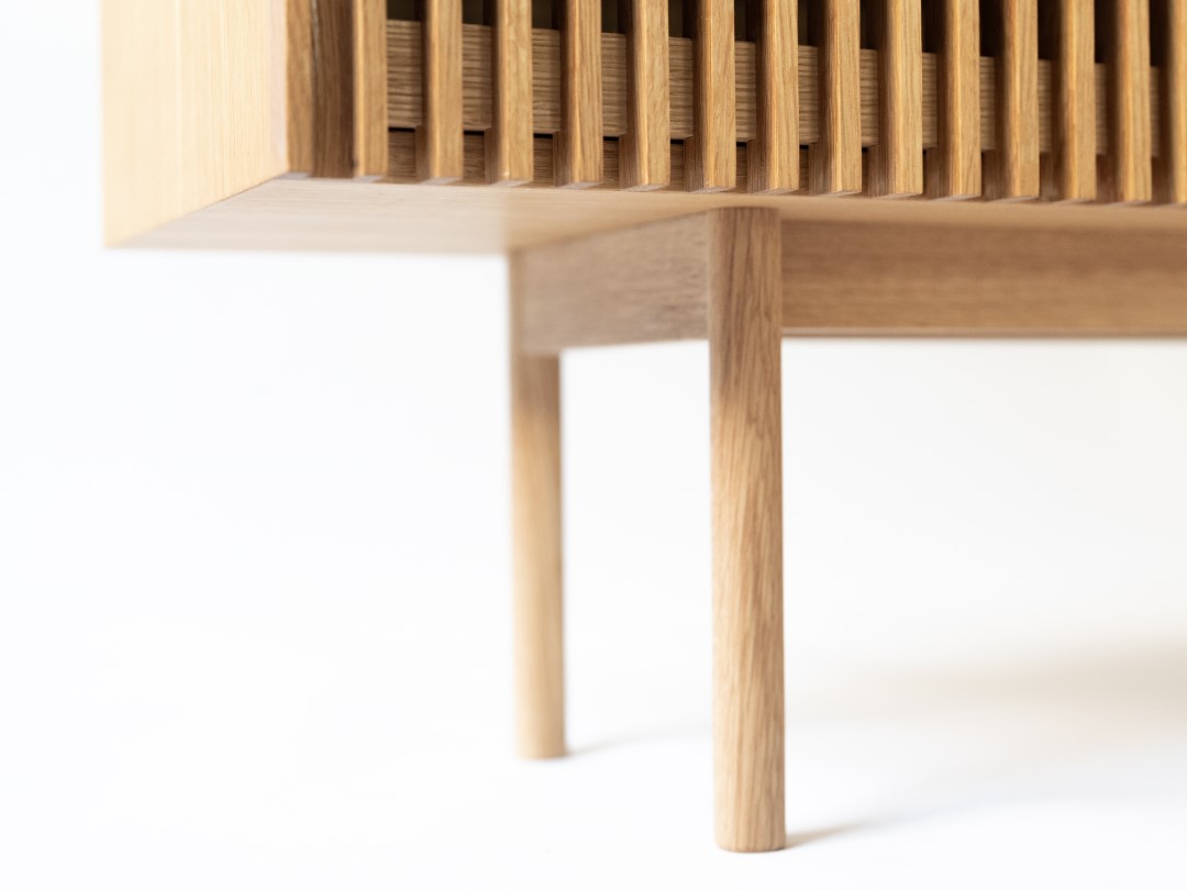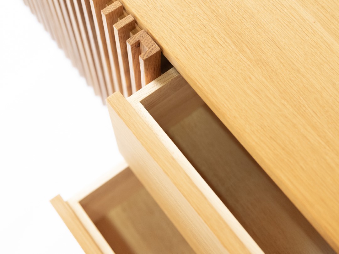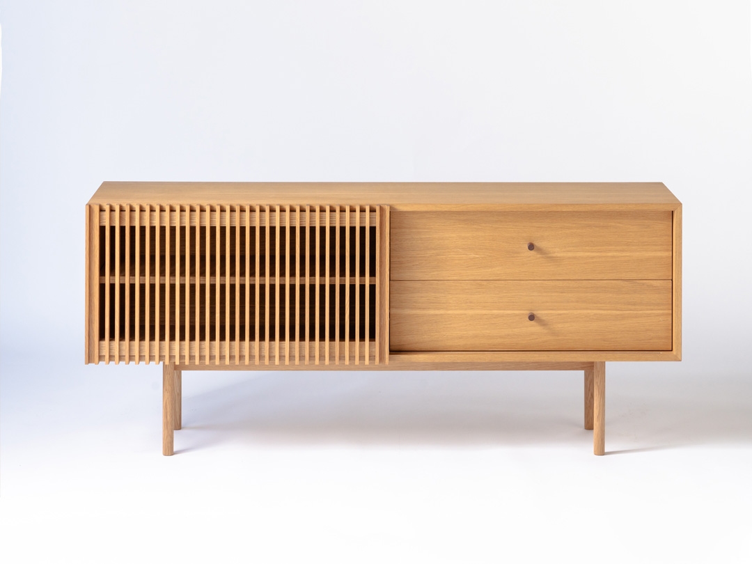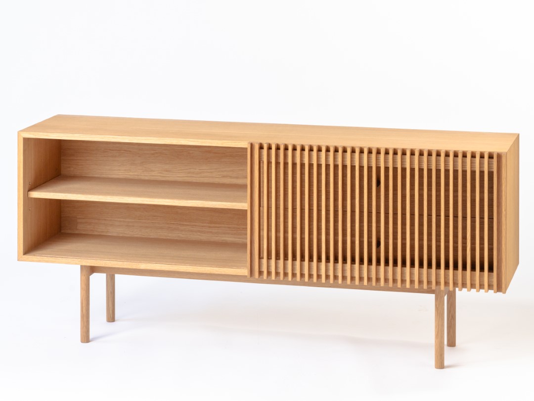 シャープなルーバーと枠の中に納まった引き出しが、端正な印象を作っているシェルフ。扉周りも余計な部材などが一切ない、ミニマムなデザイン。脚がなく壁に直接取り付けるバージョンも製作可能。