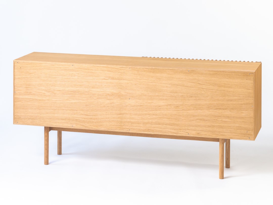 シャープなルーバーと枠の中に納まった引き出しが、端正な印象を作っているシェルフ。扉周りも余計な部材などが一切ない、ミニマムなデザイン。脚がなく壁に直接取り付けるバージョンも製作可能。 ※AM08は脚なしで建築柱に直接取り付ける構造です。別注モデルになりますのでご相談ください。